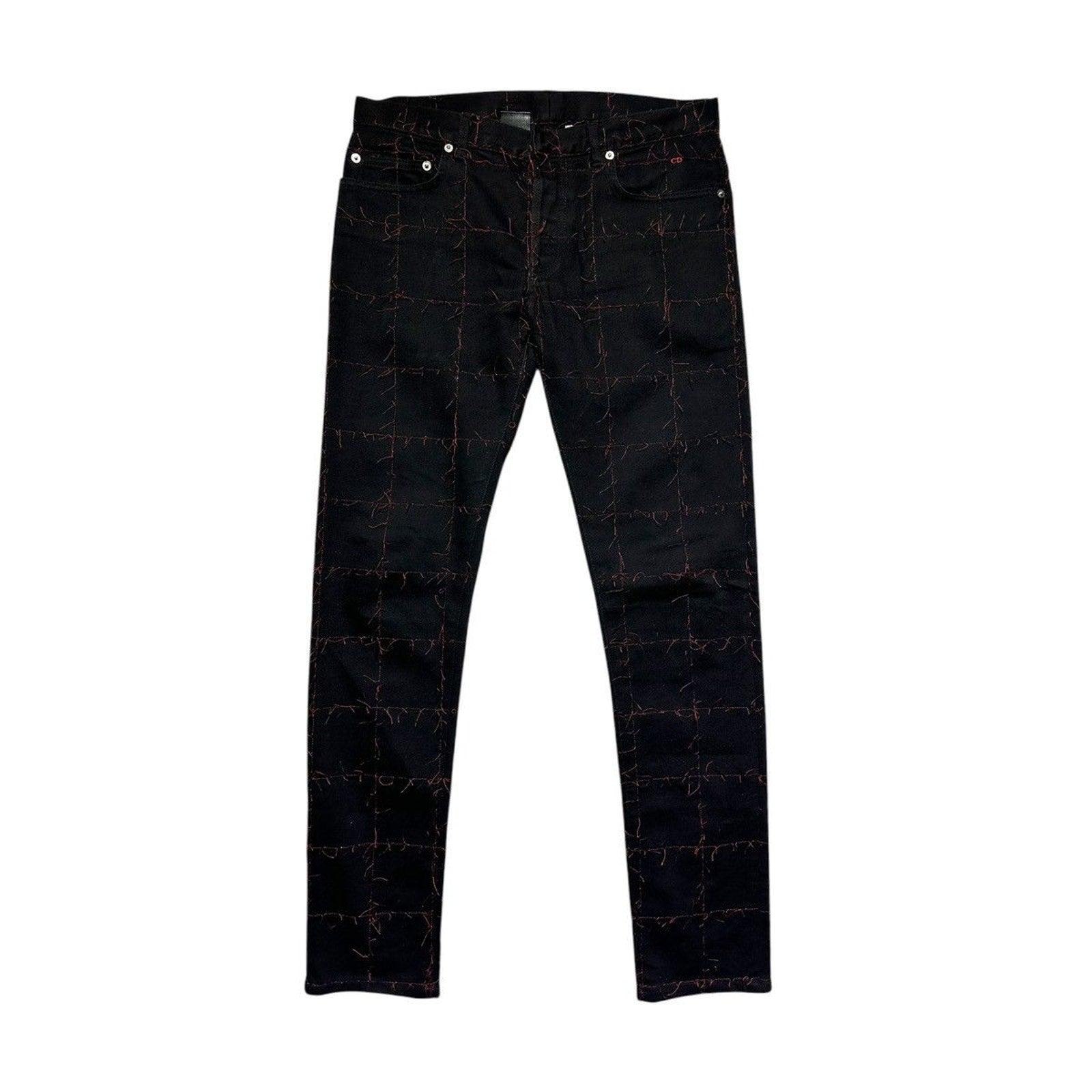 A rare piece from an iconic collection. Deep black slim fit denim with striking red exposed stitches throughout.Waist: 32”Rise: 9”Inseam: 32”Leg Opening: 6.5”Shipping Policy• Please allow 2-5 business days for us to process and ship your order. When your order ships, you will receive your tracking number via email.Refund Policy• All sales are final.