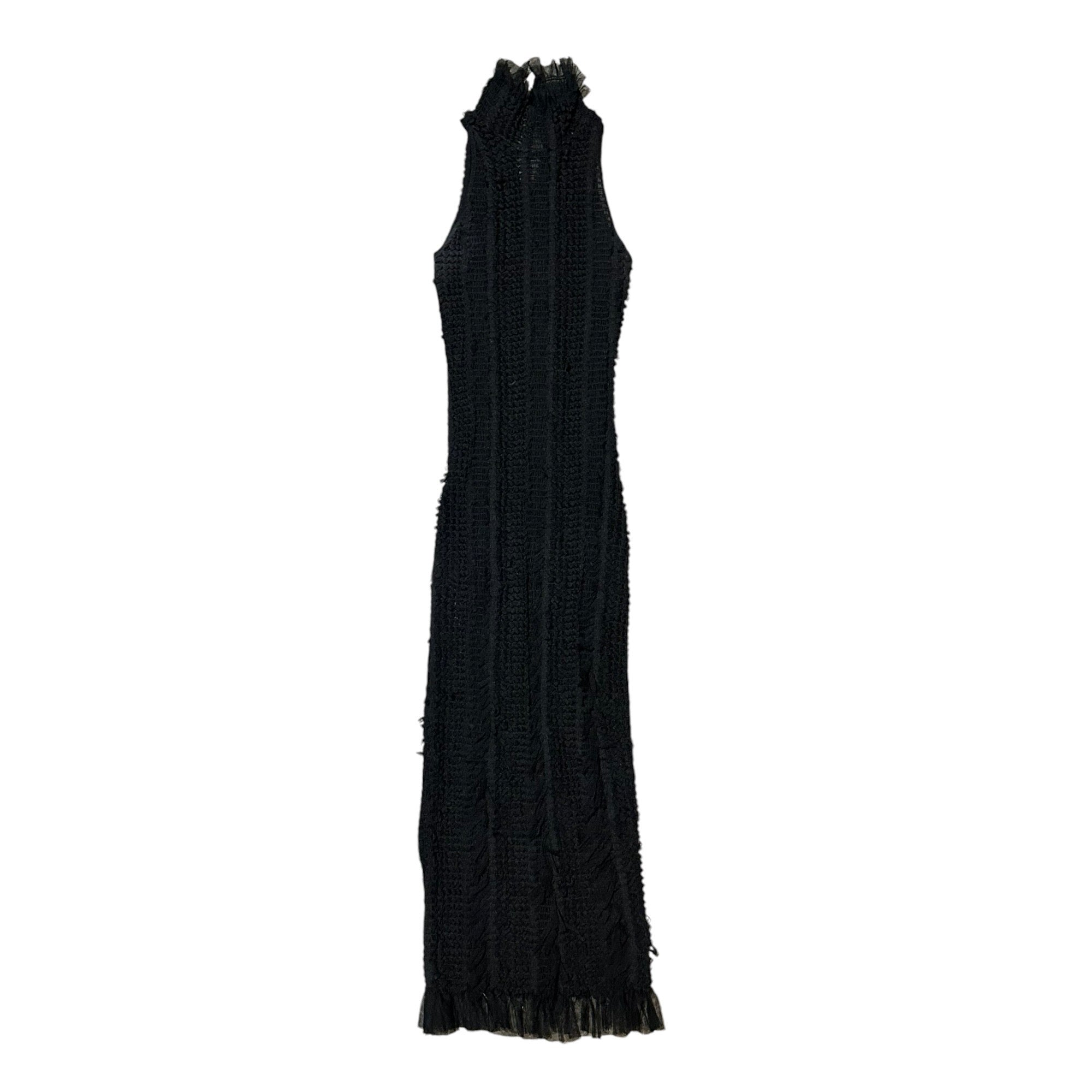 An effortless piece. Deep black quality fabric that stretches and perfectly hugs the body. The perfect grab and go dress. Shoulders: 10”Pits: 9”-20”Length: 46”Leg Opening: 12”-23”