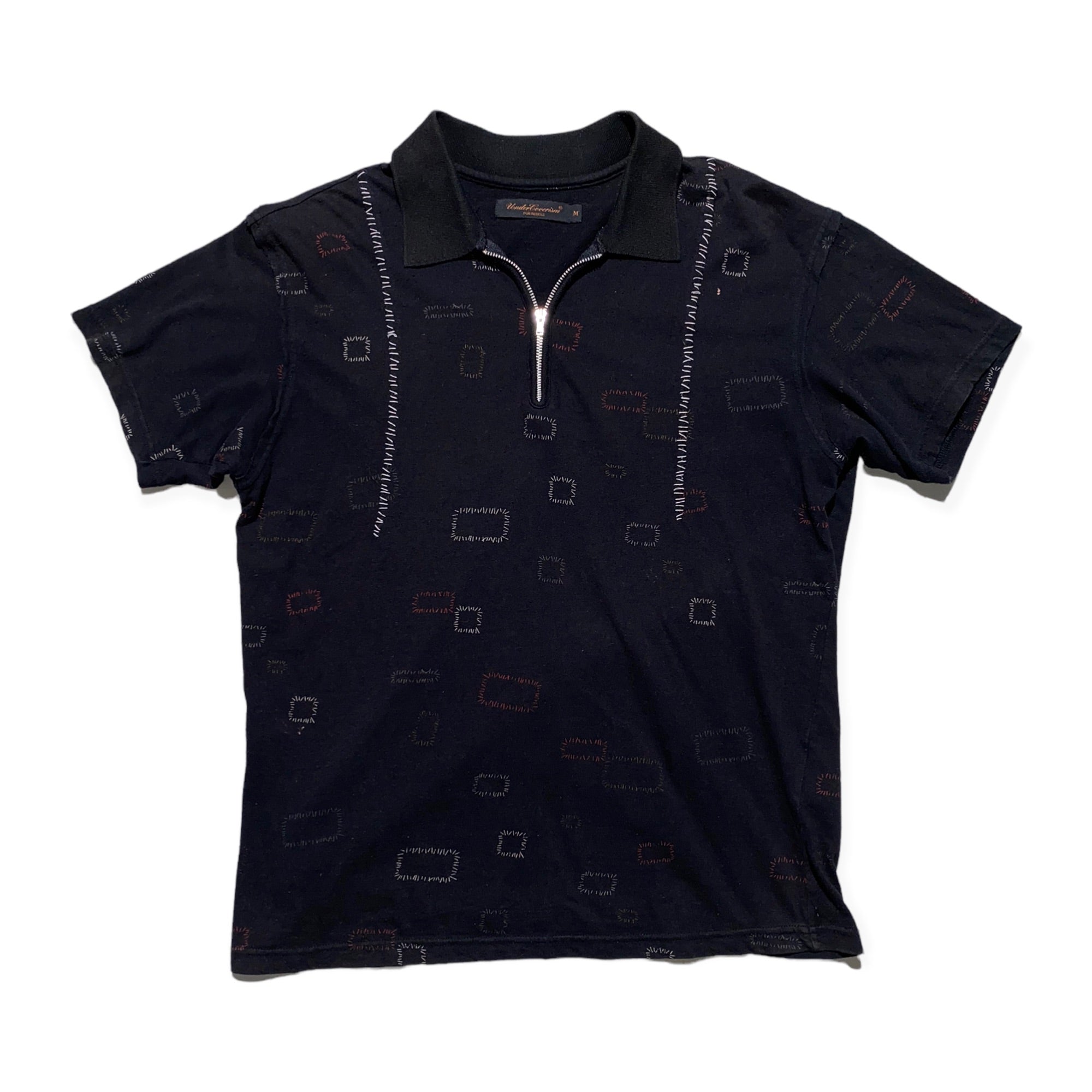 From the 2003 collection. Soft black cotton polo with scab stitch print design throughout and multi stitch at both shoulders going down. Flaw: small discoloration mark , and normal piling. Still lots of life and a great historic piece.