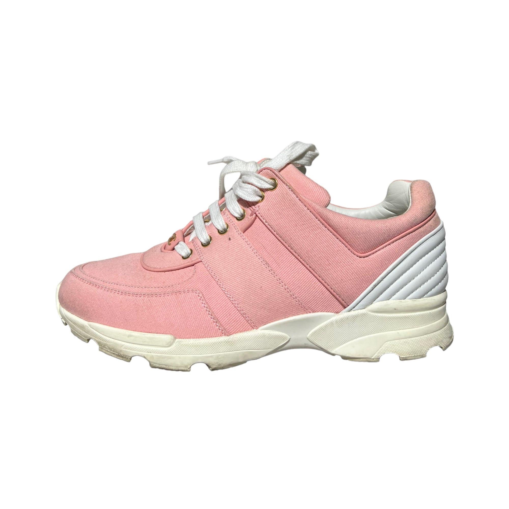 Used condition with tons of life left. A soft pink thick canvas upper and white sole. Golden Chanel logo. Superb craftsmanship.