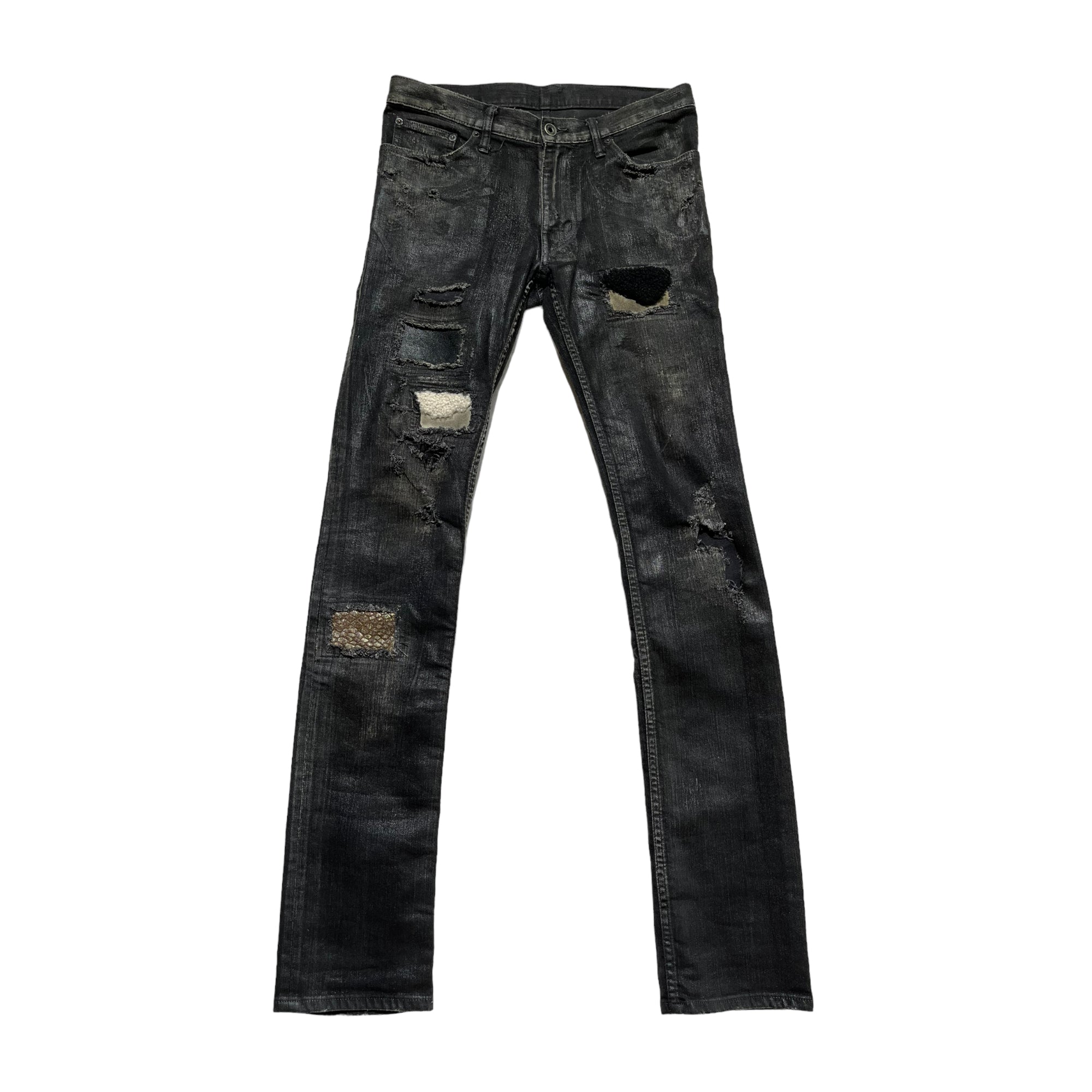 An absolutely insane pair of waxed denim. Patchwork throughout featuring snake skin, leather & suede patches, fur, etc. subtle and elegantly placed. Slight gloss/wax on these. These look way better in person. Nice stretch to these for comfort.
